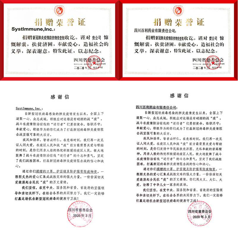 澳门大阳城官网-大阳城(中国)携手美国西雅图免疫,中美企业共同通过四川慈善总会,向四川和湖北等一线医院分批次捐赠医用外科口罩和N95口罩、护目镜、防护服等防护用品。向全国几十家医院捐赠抗病毒药物新博林(利巴韦林颗粒)和提高免疫的好好黄芪颗粒等,助力一线医护抗疫